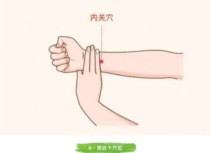 按摩時,一隻手的拇指放在對側手臂的內關穴上,稍微向下點壓用力後,保持壓力不變,旋轉揉動,點揉1分鐘以後再換對側。按摩時以產生酸、麻、脹感為最佳。